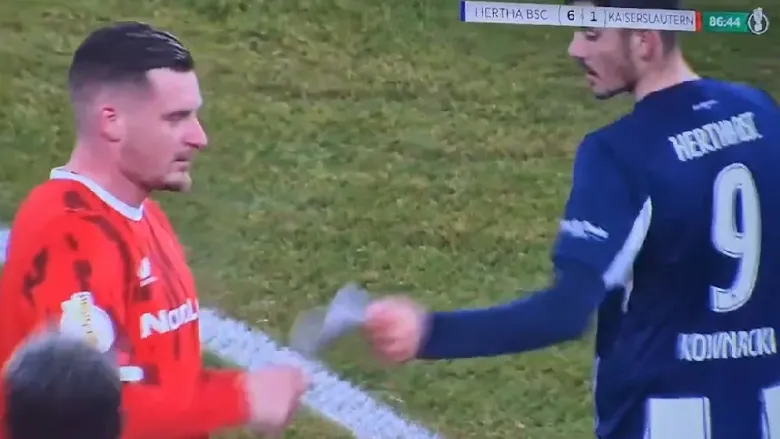 Offside Фудбал Што препишуваш на терен? Во дербито на колото во германска втора Бундеслига, Херта во Берлин со 6-1 го растури Кајзерслаутерн. Во еден момент стрелецот на петтиот гол за Херта Берлин Давид Ковнацки ладно му зема еден лист на Марлон Ритер од рака кој му го пратил тренерот. SharePostСподели SharePostСподели објавено: 3 декември 2025 - 09:51