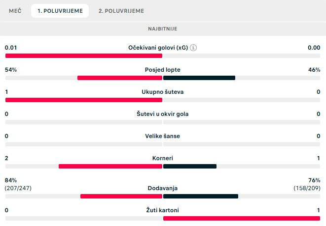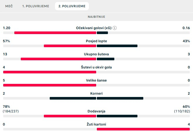 Во бројки тоа е 13:3 удари од кои 4:0 во рамки на гол во корист на домаќините, кои победија со 1:0.