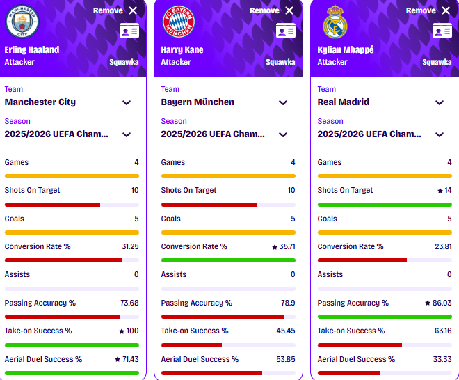 Напаѓачите на Сити, Баерн и Реал се гол машини кои газат сезонава. Норвежанецот и Франузинот имаат по 18 гола на сите натпреварувања, а Англичанецот 22. Интересен факт од ЛШ, каде имаат неколку идентични бројки, како на пример број на голови, а Халанд и Кејн дури и ист број на удари.