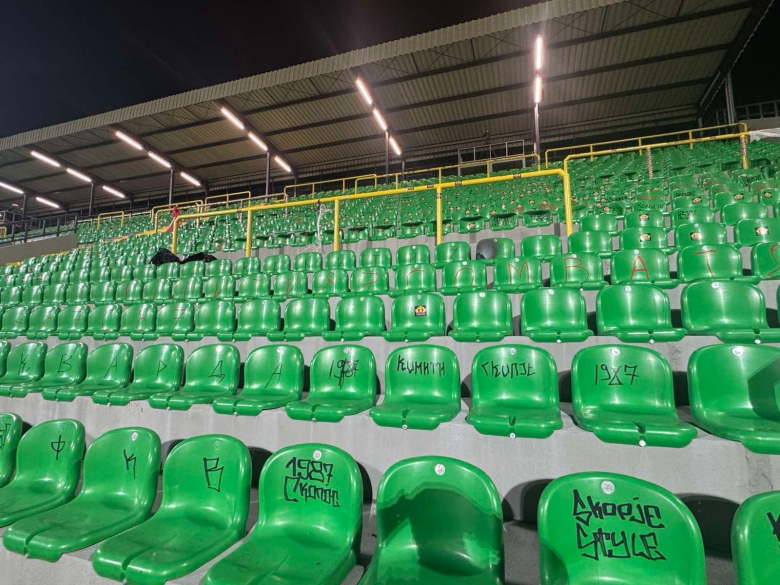 Битолскиот клуб објави фотографии од реновираната јужна трибина на која стоеа гостинските навивачи кои залепиле неколку налепници, демолирале или запалиле пар седишта.