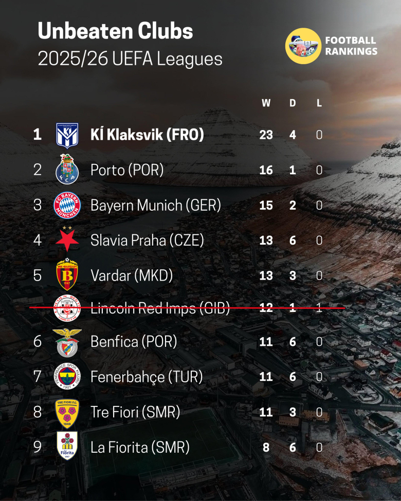 На листата непоразени европски клубови во своите домашни првенства се уште и КИ Клаксвик од Фарски Острови, Порто, Баерн Минхен, Славија Прага, Вардар, Бенфика, Фенербахче, Тре Фиори и Ла Фиорита од Малта.