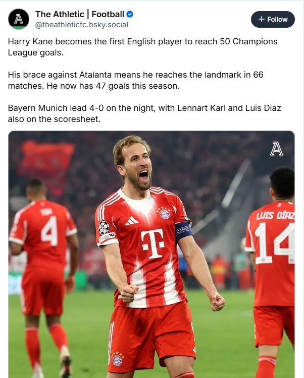 Гол машината Хари Кејн меле сезонава. На Аталанта синоќа им даде два комада, еден од пенал, еден од игра. Едноставно си поигра со двајцата чувари. Има 10 во ЛШ на 9 меча и 30 во Бундес на 25 средби. Страшен просек држи сезонава на сите натпреварувања од 47 гола на 39 меча. Синоќа стана и прв Англичанец со 50 гола во ЛШ.