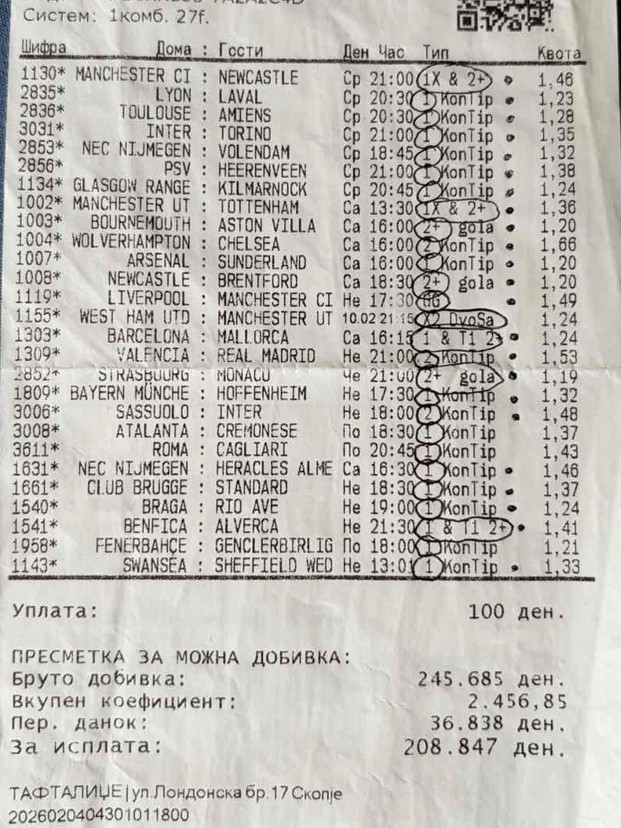 Offside Кец у два Махер на колото кој фатил 27 утакмици SharePostСподели Ако имате добитен тикет или ако една ве зафркнала, пратете ни го на tipster@trendolend.mk. SharePostСподели Тагови: махер на колото објавено: 13 февруари 2026 - 08:15