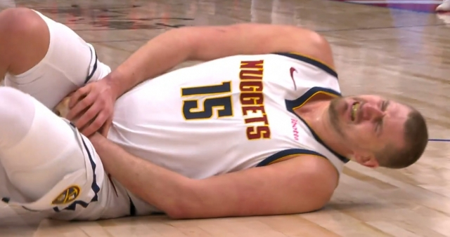 Nikola Jokić takes a hit in the groin from Cade Cunningham and goes down; officials review and rule it a common foul, Cunningham's 3rd. Jokić would stay in the game.