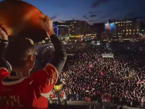 The Danish men’s national team are being celebrated by a packed Rådhuspladsen in Copenhagen.