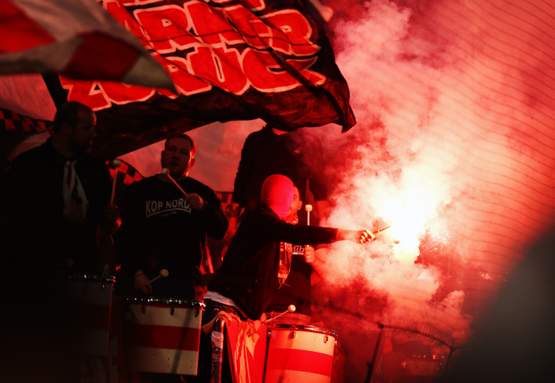 Bengalas en la zona de animación local, y tifo en la zona visitante (en Alemania eso está permitido Y favorecido). pic.twitter.com/wI5RHW1HP3