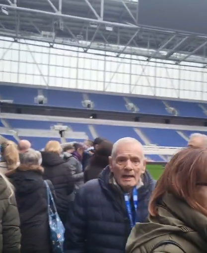 Unas hijas llevan a su padre, fanático del Everton, a conocer el nuevo estadio.