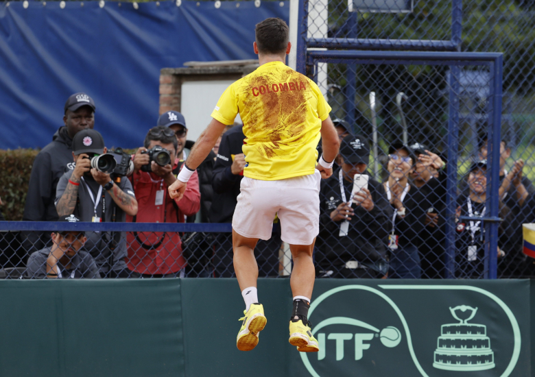 Colombian players celebrate Davis cup victory in a provocative way and the crowd responds with thrown bottles.