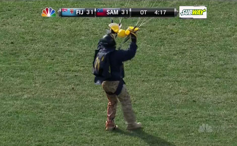 Offside Разно Падобранец во погрешно време Никој не го известил падобранецот дека натпреварот за третото место не е завршен, па тој слета со топката за финалето на рагби првенството во Лас Вегас додека се уште се играа продолженијата на дуелот помеѓу Самоа и Фиџи. SharePostСподели SharePostСподели објавено: 12 февруари 2013 - 11:42