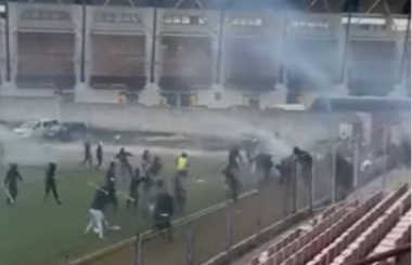 Црногорска втора лига или не се знае кој јаде, кој плаќа. Навивачите на Сутјеска ги напаѓаат навивачите на Беране со стапови.