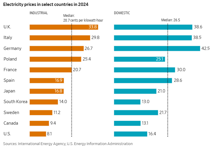 Германија сега има највисоки домашни цени на електрична енергија во развиениот свет, додека Велика Британија има највисоки стапки на индустриска електрична енергија, според кошничка од 28 големи економии анализирани од Меѓународната агенција за енергија. Италија не е далеку зад нив.