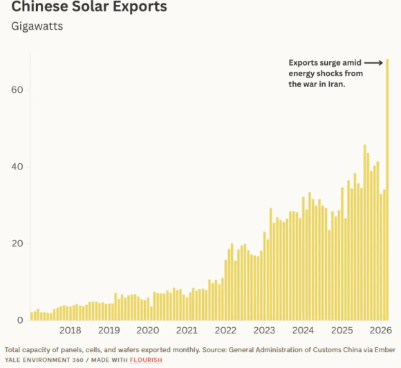 Само во првиот месец откако САД и Израел ја почнаа војната против Иран, Кина двојно го зголемила извозот на соларни панели. Според „Јејл Енвиромент 360“ Кина во март продала системи со фотоволтаични ќелии и силиконски плочки со капацитет да генерираат 68 гигавати електрична енергија.