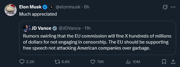 „Се шпекулира дека Европската комисија ќе го казни Икс стотици милиони долари затоа што не се вклучува во цензура. ЕУ треба да ја поддржува слободата на говорот, а не да ги напаѓа американските компании за ѓубре“, напише Венс.