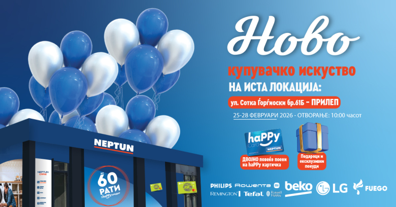 Новата продавница во Прилеп нуди повеќе простор, појасна организација на одделите и подобрена понуда, со што купувањето станува побрзо, полесно и попријатно. Посетителите ќе можат да се запознаат со најновите технолошки производи, иновативни решенија за домот, како и со стручна поддршка од тимот на Нептун, подготвен да помогне при секој избор.
