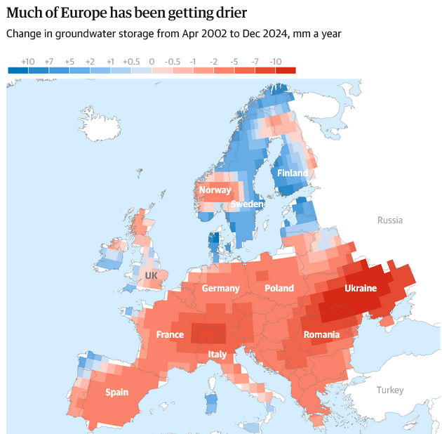 Наодите откриваат остра нерамнотежа: северот и северозападот од Европа - особено Скандинавија, делови од Велика Британија и Португалија - стануваат повлажни, додека големи делови од југот и југоистокот, вклучувајќи делови од Велика Британија, Шпанија, Италија, Франција, Швајцарија, Германија, Романија и Украина, се исушуваат.