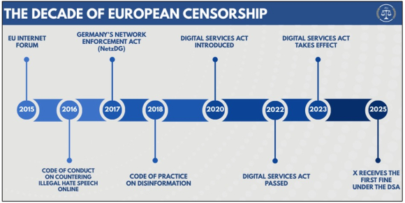 Децениската кампања за цензура не покажува знаци на замор. Минатата недела Европската комисија го казни Икс со 140 милиони евра поради прекршување на Законот за дигитални услуги и се закани дека ќе ја забрани платформата во ЕУ.