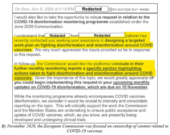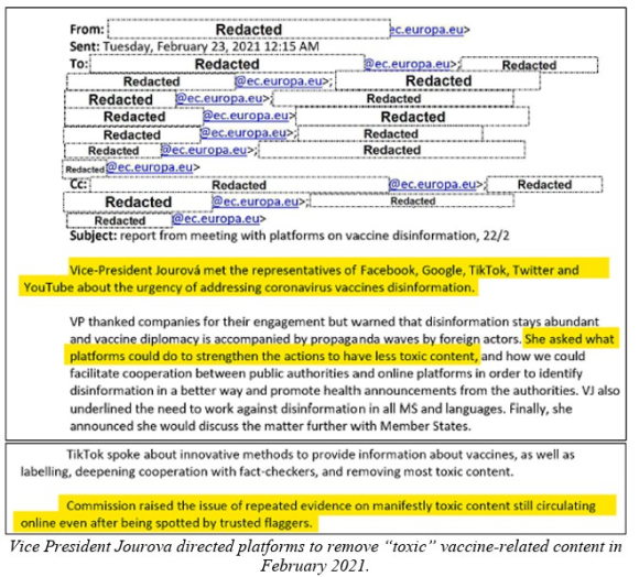 Оваа кампања за цензура започна долго пред усвојувањето на Законот за дигитални услуги (DSA). Уште во 2020 година, претседателката на Европската комисија Урсула фон дер Лајен и потпретседателката Вера Јурова им наредиле на платформите да ги променат своите правила и да отстранат содржини што ги доведуваат во прашање воспоставените наративи за пандемијата на ковид и вакцините, заклучува Комитетот за судство.