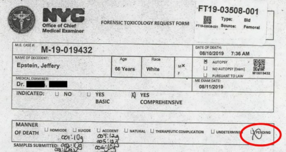 Во редактирана верзија на документот за обдукцијата на Епстин, објавен во декември од Министерството за правда, во прашалникот за начинот на смртта е штиклиран одговорот „во исчекување“, а полињата „самоубиство“ и „убиство“ се оставени празни.