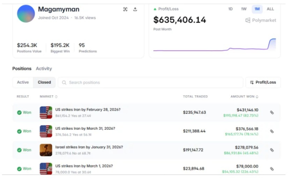 Корисник со псевдонимот „Magamyman“ заработил 553.000 долари, обложувајќи се на онлајн кладилницата Полимаркет дека ајатолахот ќе биде симнат од власт до 28 февруари. Смртта на Хамнеи беше потврдена вечерта. Шестмина сомнителни корисници, за кои се шпекулира дека биле инсајдери, неколку дена претходно вложиле вкупно 1,2 милиони долари дека САД најдоцна до 28 февруари ќе го нападнат Иран.