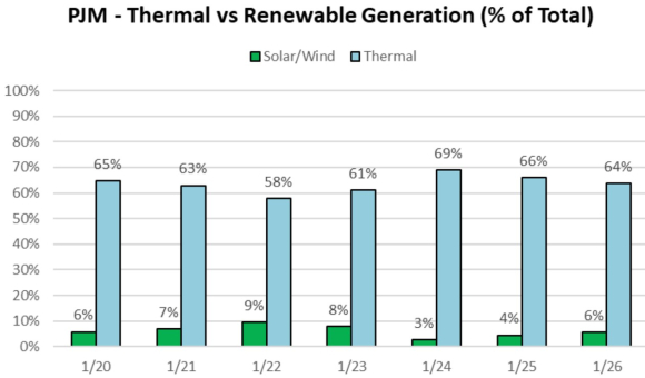PJM Interconnection - најголемиот оператор на електрична мрежа во САД, објави дека во понеделникот термоцентрали на гас обезбедиле 41% од вкупната произведена енергија. Од нуклеарни централи биле добиени 27%, а од централи на јаглен 24%. Обновливите извори, како ветерот и сончевата енергија, обезбедиле под 5% од струјата.