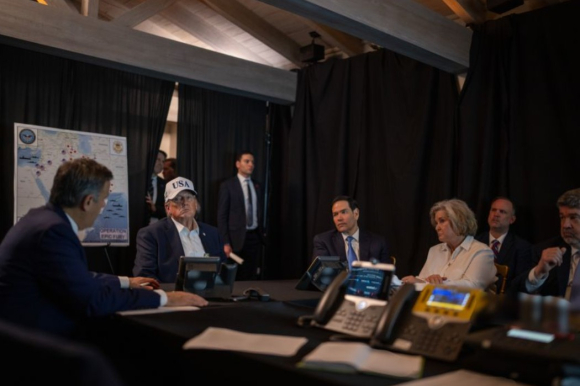 Во собата биле и шефицата на кабинетот на Белата куќа, Сузи Вајлс, државниот секретар и советник за национална безбедност Марко Рубио, министерот за одбрана Пит Хегсет, шефот на Здружениот генералштаб, генералот Ден Кејн, директорот на ЦИА Џон Ратклиф, и главните преговарачи со Иран – Стив Витоф и Џаред Кушнер, зетот на претседателот Трамп. Составот бил мал, за да се спречи протекување информации. Другите министри не биле ни информирани за состанокот. Фалел само потпретседателот Џ. Д. Венс, кој бил во Азербејџан и не можел итно да се врати.