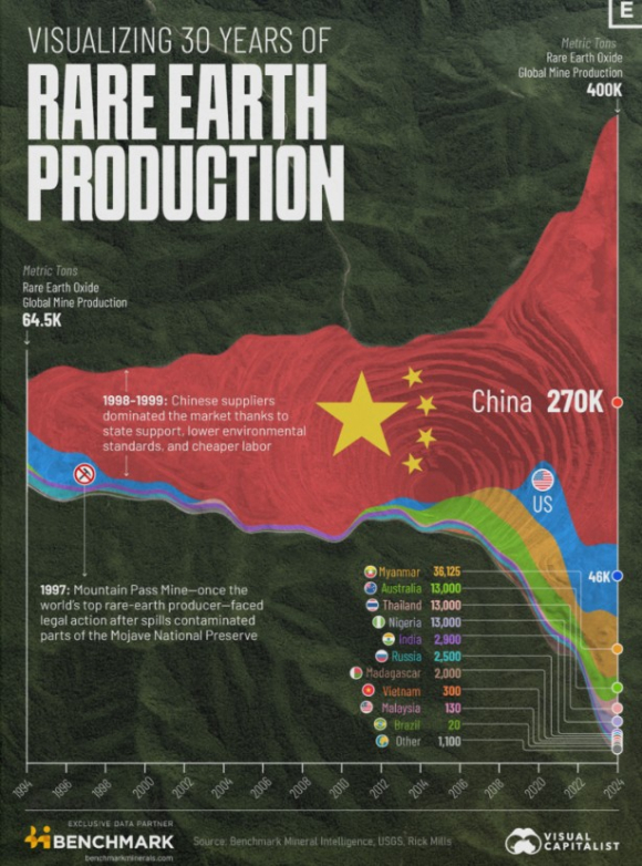 До почетокот на 2020-тите, Кина учествуваше со околу 70% во глобалното рударство на ретки метали и повеќе од 90% во преработката. Тоа му овозможи на Пекинг да ги третира ретките метали како стратегиско средство за одговор на трговски мерки, санкции и притисоци.