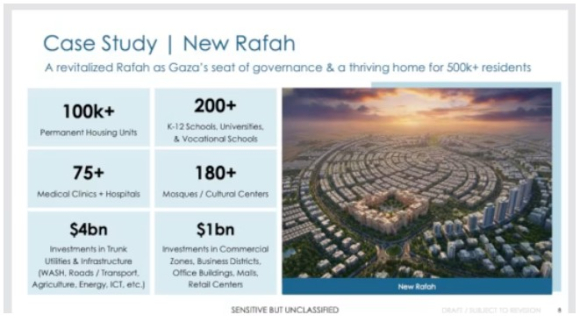 главните промотори на проектот Sunrise, кој треба да ја претвори палестинската енклава Газа, уништена од израелско бомбардирање, во футуристичка крајбрежна дестинација. Изработен е нацрт-проект од 32 страници, исполнет со скици од висококатници, паркови, но и графикони и табели со планирани трошоци. Во проектот има место и за Палестинците, кои од шатори, глад и беда би биле префрлени во пристојни домови, изобилство и просперитет.