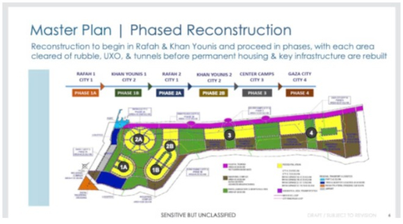Планот е поделен во четири фази. Во првата е предвидено отстранување на уништените згради, неексплодираната муниција и тунелите на Хамас, додека на жителите им се обезбедува привремено засолниште, теренски болници и мобилни клиники. Во втората фаза би почнала изградба на станбени згради, медицински установи, училишта и верски простори. Ќе се поплочат патиштата, ќе се поврзат далноводи, ќе се засадат култури. Потоа ќе се реализираат раскошните имоти на плажа и модерните транспортни центри.