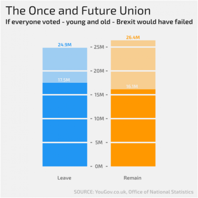 Иако по референдумот во сите демографски анализи главната вина паѓа на постарата генерација, заради нивната решителност дека Британија треба да се оддели од ЕУ, она што најчесто се пропушта е дека младите сносат сериозна одговорност за тоа што им се случи. Младите гласачи во Британија ретко излегуваат на избори. При гласањето за членови на Парламентот во 2005, гласовите на оние под 25 години изнесувале половина од оние над 65. Една од наведуваните причини за ваквата ситуација е верувањето помеѓу помладите гласачи дека нивните гласови не прават разлика. Но иронијата во случајот со брегзит е дека токму тие можеа да одлучат за резултатот.