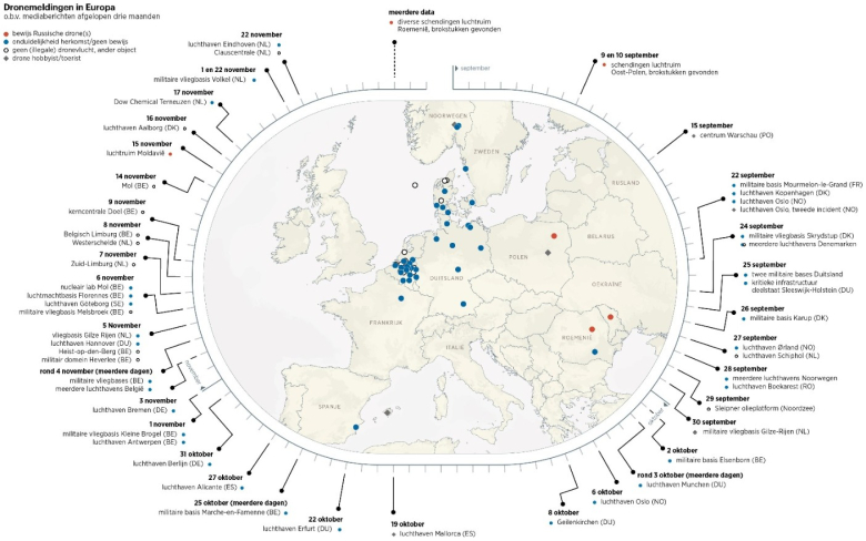 Користејќи ја платформата Dronewatch, холандскиот портал Троув анализирал вкупно 61 инцидент со дронови во 11 европски земји во изминатите три месеци и открил општа конфузија, чести лажни аларми и малку цврсти докази за руска вмешаност.