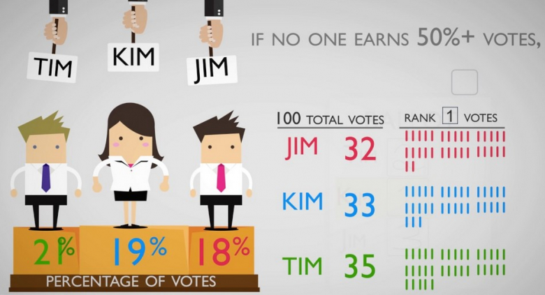 Можеби звучи компликувано, но не е. Во случај кога никој нема апсолутно мнозинство од 50% плус еден, прво се елиминираат оние кандидати кои биле најмалку прворангирани а гласовите дадени за нив се прелеваат кај оној што бил второпласиран кај нивните гласачи. Процесот со елиминација и прелевање на гласовите се продолжуваа сè додека не се стигне до еден кандидат кој има јасно мнозинство.
