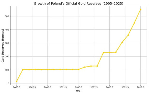 Златните резерви на Европската централна банка изнесуваат околу 506,5 тони. Полските резерви од 550 тони ја зајакнуваат позицијата на Варшава во европската финансиска архитектура.