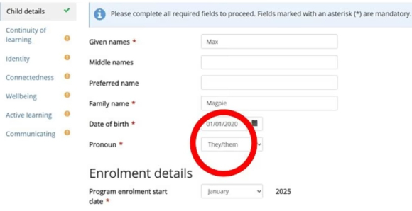 Од вкупно 57.941 дете на предучилишна возраст од актуелната генерација во австралиската сојузна држава Квинсленд, 46 родители побарале за нивните деца да се користат заменките „тие/нив“. Од 41.392 пријавени за 2026 година, воспитувачите ќе мора да користат „тие/нив“ за 11 деца.