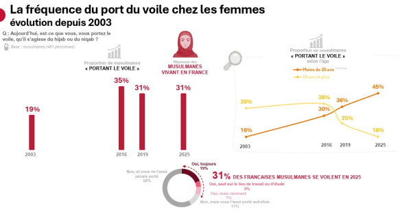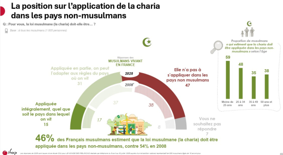 Анкетата на ИФОП направена за списанието Ecran de veille покажува дека на 57% муслимани на возраст помеѓу 15 и 24 години поважно им е да се придржуваат до шеријатските прописи, отколку до законите на Републиката, а тие се судираат, особено за бракот, наследството или за ритуалното колење животни.