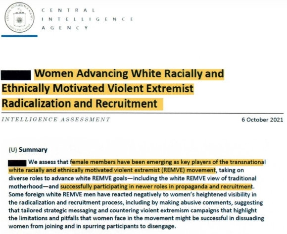 Трамп неодамна ја поништи разузнавачката проценка од октомври 2021 година во која „мајчинството“ и „домаќинството“ биле дефинирани како индикатори за „бел расно и етнички мотивиран насилен екстремизам“ (REMVE).