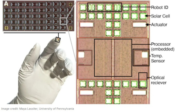 Најголемиот дел од микророботот всушност се соларните плочи што го напојуваат со 75 нановати, енергија 100.000 пати помала од батерија на рачен часовник.