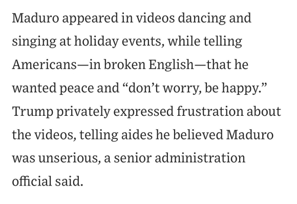 „Редовното јавно играње на музика на господинот Мадуро и другите знаци на негова ноншалантност убедиле членови на тимот на Трамп дека тој ги заебава и пробува да изнуди реакција за која бил убеден дека е блеф, рекле двајца анонимни извори на Њујорк Тајмс. Трамп приватно бил фрустриран од ваквите видеа“.