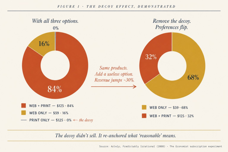Бихевиоралната економија ова сидро првпат го документира во 1974 година. Секое мени го става својот најскап производ близу до врвот на секој дел. Не за да го продаде, туку за да ја постави референтната точка.