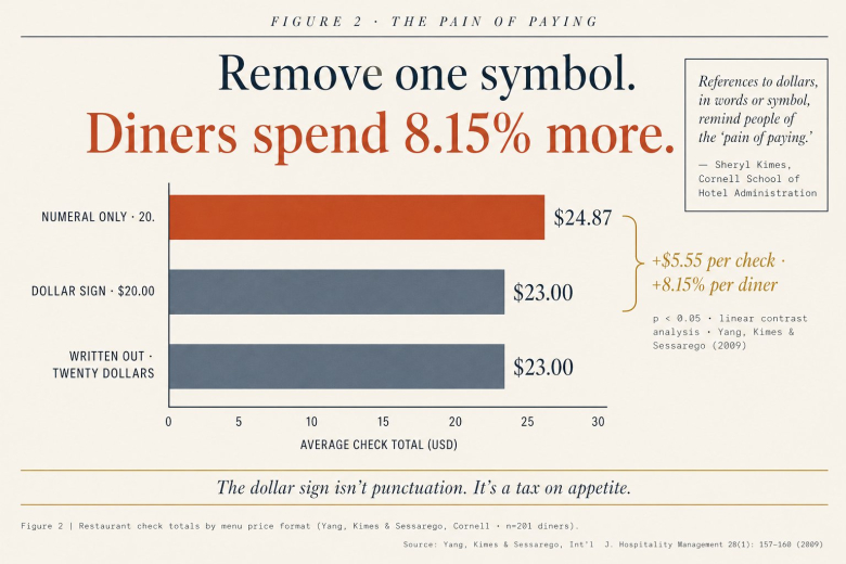 Во 2009 година, спроведен е контролиран експеримент во кафетеријата на Кулинарскиот институт на Америка. 201 гости. Три верзии на менито: „20,00 долари“, „20.“ или „дваесет долари“. Резултат: гостите со менија без знак за долар потрошиле повеќе, во просек - 8,15% повеќе по лице.