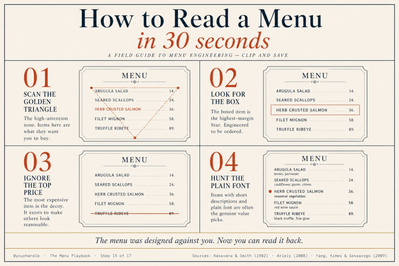 Истражувањата на следењето на очите на менијата е мешано во однос на точната патека, но практиката е универзална: Ѕвездите одат во зоната со големо внимание. Лузерите се туркаат во визуелните гробишта долу лево. Најпорачувана ставка на повеќето менија не е таму затоа што им се допаѓала на клиентите. Таа е таму затоа што дизајнерите ја поставиле таму.