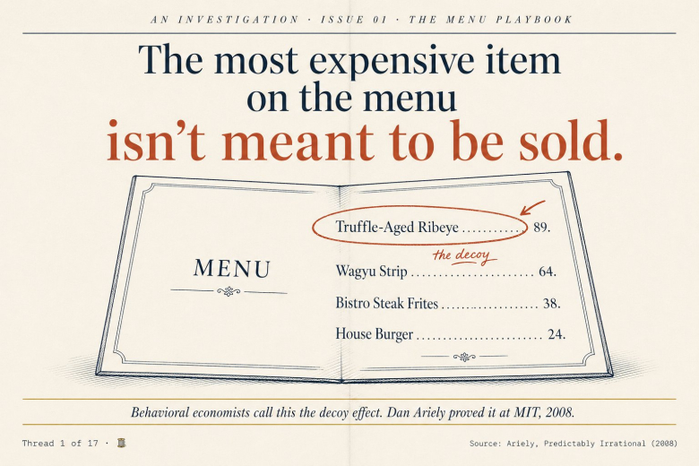 Откако ќе видите „зреен бифтек од 2.000 денари“, бифтекот од 1.200 под него се чини како паметна зделка. Не е. Само е веднаш до нешто поскапо.