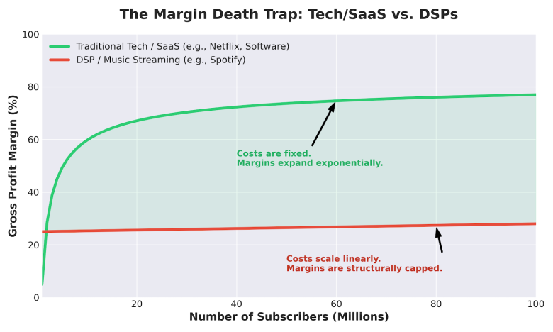 Во бизнис како Нетфликс, како што се добиваат повеќе претплатници, профитните маржи се зголемуваат експоненцијално бидејќи фиксните трошоци остануваат релативно стабилни. Откако Нетфликс ќе пукне 20 милиони долари за да продуцира оригинален филм, таа цена е фиксна. Без разлика дали 1 милион или 100 милиони луѓе го гледаат, цената не се менува а маржата се зголемува. Стриминг музиката функционира обратно. Аудио платформите исплаќаат приближно 70% од секој заработен долар на носителите на права (етикети и издавачи), па нивните трошоци линеарно се зголемуваат со нивната корисничка база. Секој пат кога се стримува песна, дел од парите одат надвор.