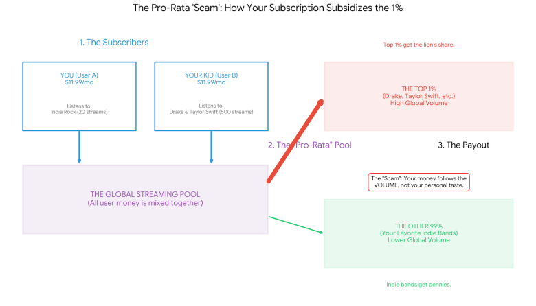 Да речеме дека сте 35-годишник кој слуша само инди-рок бендови. Плаќате 11,99 долари месечно. Но, вашето 14-годишно дете е на вашиот семеен пакет и по осум саати дневно ги слуша Дрејк и Тејлор Свифт. Поради пропорционалниот модел, тие 11,99 долари не одат кај инди-бендовите што ги сакате. Огромното мнозинство од парите се насочуваат директно кон првите 1% од поп-ѕвездите, затоа што тие командуваат најголем обем на стримови во светот. Системот е наштиман да ги субвенционира мега-ѕвездите, а да ја изгладнува средната класа.