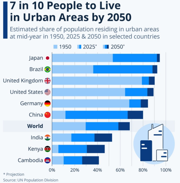 Според проценките на Обединетите нации, 57% од светската популација сега живее во градски средини. Оваа бројка би можела да се зголеми на 68% до 2050 година, поттикната од континуираната урбанизација во најсиромашните земји во светот, главно во Азија и во Африка, се предупредува на Светскиот ден на живеалиштата.