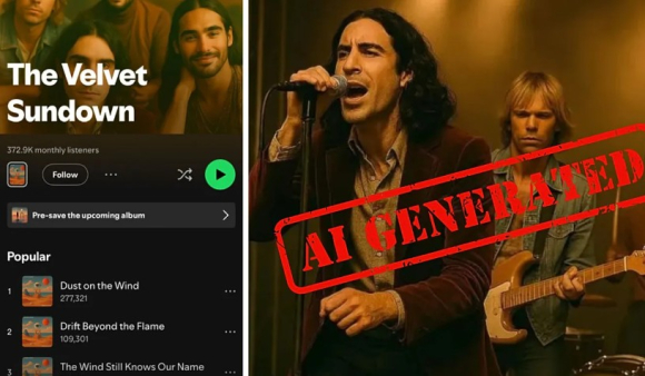 Првиот голем пробив на вештачки создадената музика го направи групата „The Velvet Sundown“ чии песни беа преслушани повеќе од милион пати на платформата Спотифај пред да се открие дека целиот проект е генериран од алатка со ВИ. Музичари уште тогаш побараа јасно да биде етикетирана употребата на вештачка интелигенција во песните. Спотифај во септември најави нов индустриски стандард, но песните на The Velvet Sundown сè уште не се обележани како вештачки.