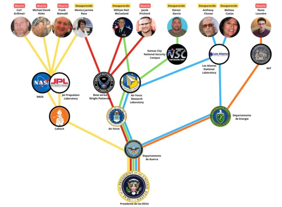 Нема јавно потврдени официјални врски помеѓу случаите, но географски се групирани во Ново Мексико и Калифорнија. Повеќето исчезнати лица се поврзани со Лабораторијата за млазен погон (JPL) на НАСА, со Националната лабораторија Лос Аламос или со Лабораторијата за истражување на воздухопловните сили, со комплексот во Розвел и воздухопловната база Рајт-Патерсон. Луѓето работеле на проекти што вклучуваат одбрана од астероиди, развој на вселенски ракетни мотори и класифицирани воздухопловни системи.