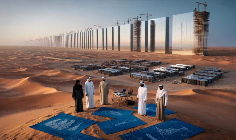 Според една проценка, изградбата на првите 12 делови до 2030 година би значело купување на поголемиот дел од светските залихи на челик и цемент и внесување на 40-метарски контејнер со материјали на секои осум секунди, 24 часа на ден. Раните фази на изградба вклучуваа ископување на 100 милиони кубни метри земја за пристаништето, срамнување со земја на планина за аеродромска писта и иселување на пустинските племиња.