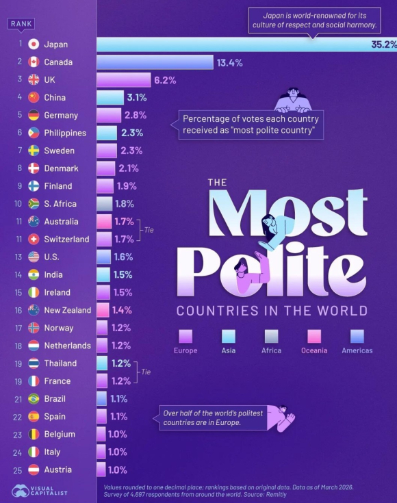 На второто место според истражувањето е Канада, која за најљубезна нација ја оцениле 13,35% од испитаниците, а на третото е Британија, со 6,23%. Кина на четвртото место е на границата од 3%.